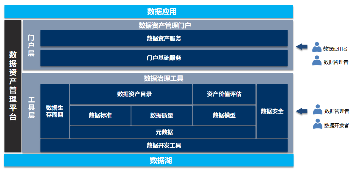 数据资产管理平台分为前端的门户层和后端的工具层。门户层面向数据使用者,实现湖中数据“能看到、能找到、能共享”,支撑数据资产运营,提高数据资产的访问和获取效率,加速数据资产价值释放。工具层面向数据管理者和数据开发者,围绕数据治理能力提供专业的数据治理工具,支撑自动化的数据资产治理,持续改进数据质量、降低管理和开发成本。