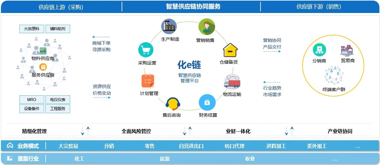 智慧供应链解决方案以企业供应链需求为导向,通过构建数字化业务运营中枢,实现覆盖计划、采购、销售、仓储、物流、资金、结算等核心环节的全流程精细化管理,适用于大宗内贸、分销零售、自营进出口、转口代理、进料加工、委外加工等各类业务模式,在业务各环节中全面落实风险管控措施,强化协同、控制风险、降低成本、提升效率。目前,平台应用范围覆盖集团内部化工、能源、农业等多个板块百余家经营单位,及延长石油、中宁化等多家外部大型集团级企业。