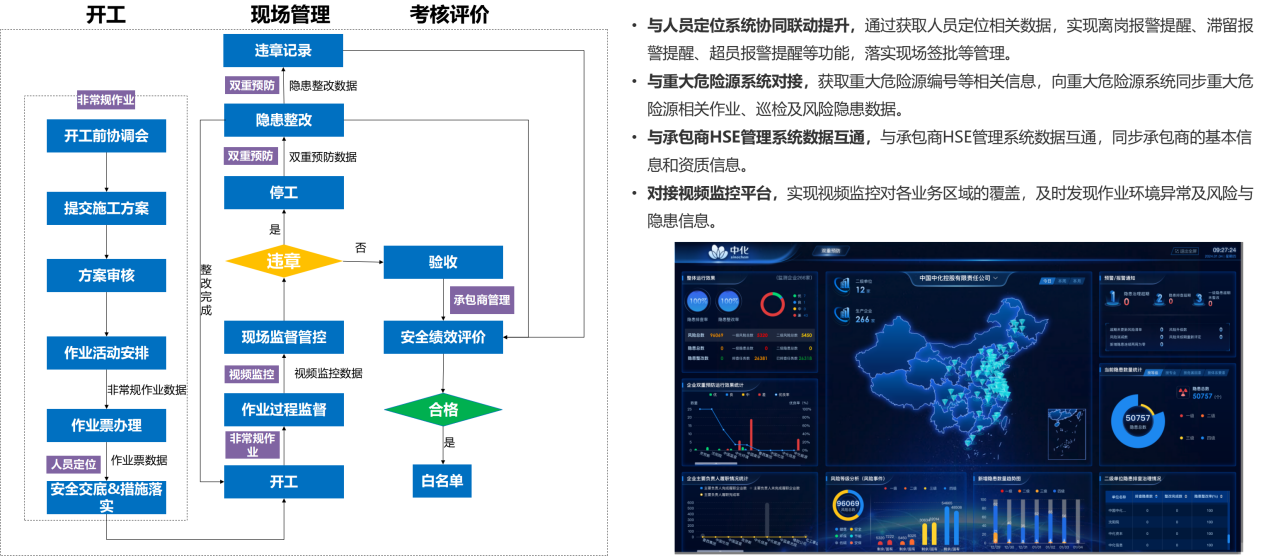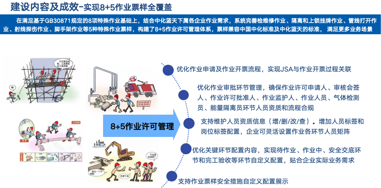 本项目紧密围绕中国中化《“智能工厂 + 智慧 HSE” 建设指导白皮书》指引,深度开展 “8+5” 作业管理系统构建工程。凭借中化数智的化工行业智能服务平台强大赋能,开展8+5作业管理系统建设,并成功推广至中化蓝天下属企业,助力企业提升HSE管理水平。塑造企业生产与安全管理全新模式及高效路径。
