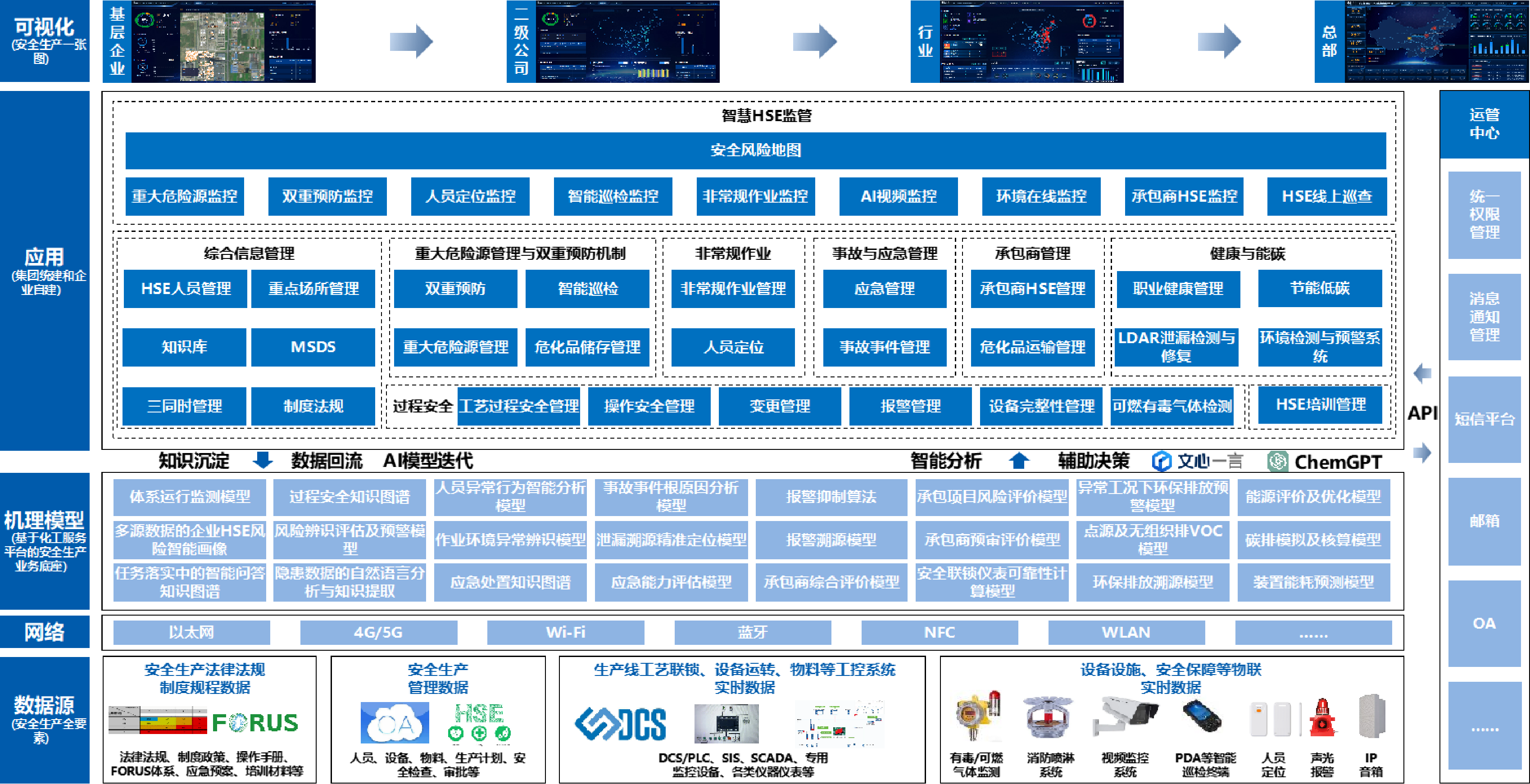 智慧HSE解决方案是以中国中化卓越运营体系与FORUS体系管理要素为基石,依照“智能工厂+智慧HSE”白皮书构建。搭建化工行业智能服务平台,组建专业团队,针对危化、工贸、矿山等多类型企业,提供从管理咨询、系统构建与维护的一站式服务。通过全方位整合,打造智慧HSE一体化解决方案,赋能企业安全风险智能化管控,实现数智化升级。