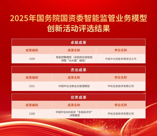 近日,国务院国资委发布2025年智能监管业务模型创新活动优秀成果名单。由中国中化申报、中化信息建设的“智能预警模型(采购供应链智能预警“AI大脑”模型)”荣获卓越成果奖,由中化信息自主研发并申报的“中国中化决策会议管理模型”、“中国中化IMS投资‘多指标评价’决策模型”分别荣获杰出成果奖和优秀成果奖,展现了公司数智化建设的积极成效,并获得上级单位高度认可。