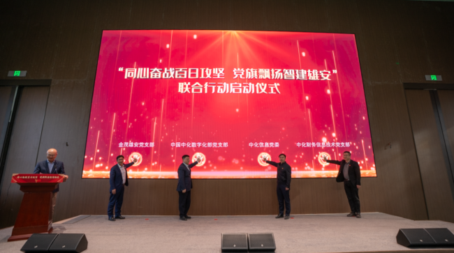 3月21日,中国中化数字化部党支部、中化信息党委、金茂雄安党支部、中化财务信息技术党支部在刚刚完成竣备的中国中化大厦现场,开展“同心奋战百日攻坚 党旗飘扬智建雄安”联合行动启动仪式暨共建主题党日活动。