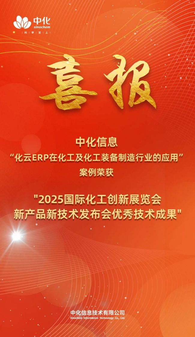 近日,在北京国家会议中心隆重召开的第12届世界化学工程大会暨第21届亚太化工联盟大会上,中化信息技术有限公司(以下简称"中化信息")申报的"化云ERP在化工及化工装备制造行业的应用"案例,荣获"2025国际化工创新展览会新产品新技术发布会优秀技术成果"奖,标志着中化信息化工行业国产ERP解决方案获得国际权威机构的高度认可。